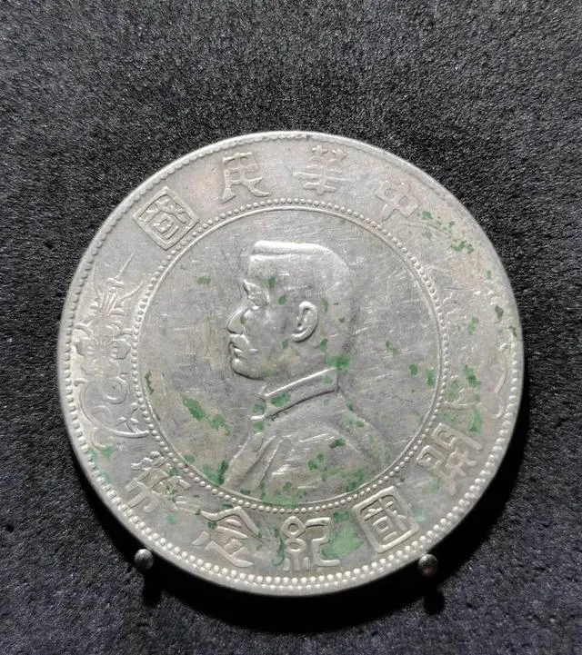 有的人家银元放得久了,像图中这枚,满身起了绿色斑点,这个行里人管叫“铜锈”或“银锈”,其实是银里头含了一点铜,年头多,阴冷潮气里就长出这一层,小时候我家老柜子暗格里摸出一块孙小头,也是斑斑点点的,看着没那么亮堂,不过行里懂行的说,这种原汁原味的包浆才最有看头,有些人鬼精鬼精非要洗得发亮,反倒把老气和故事洗没了。