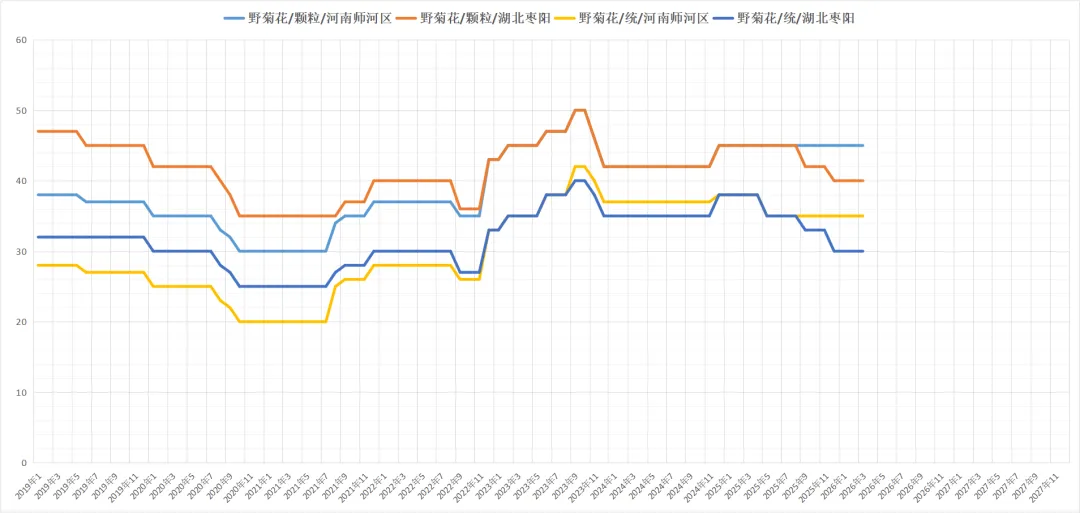 野菊花货源有量,虽有少数商家关注,但货源交易仍以厂家按需采购为主,货源小批量走销,行情未见较大改观,现70颗粒价格在33元,纯颗粒货55-56元,色选货58-60元。