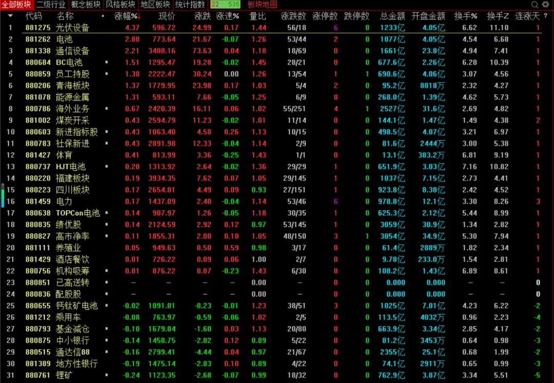 板块方面:光伏设备、能源金属、电池、电力等涨幅居前。油服工程、IT服务、通信服务、软件开发等跌幅居前。