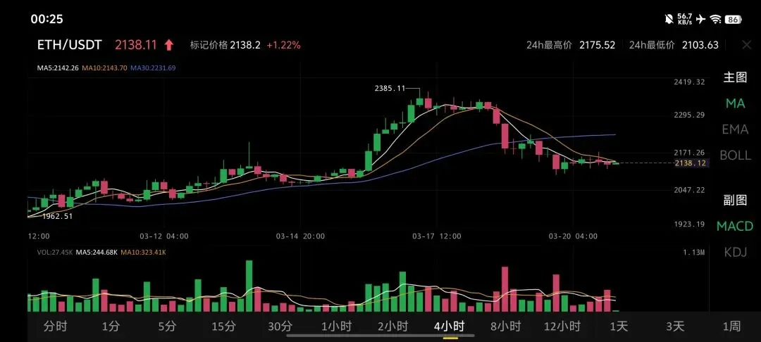 · MACD(低位钝化,底背离酝酿):MACD快慢线在零轴下方极低位置粘合,动能柱接近零轴。与BTC类似,这里存在潜在的4小时底背离结构——如果价格不再破前低(2103)且MACD形成金叉,可能触发一波技术性反弹;但若放量跌破2100,底背离可能直接失效。
