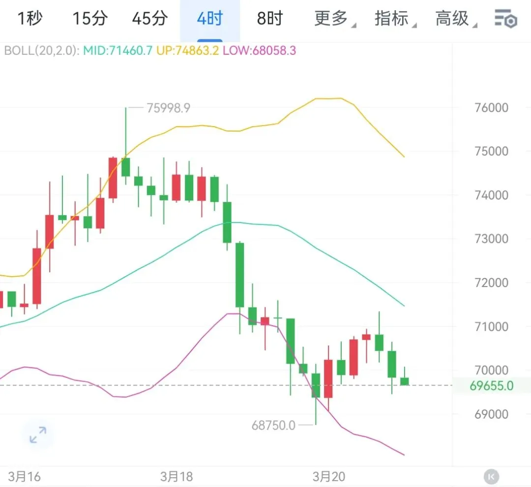 从四小时图来看,日内虽有反弹,但更多属于前期下跌结构中的整理区间修正,呈现出典型的顶底转换特征。当前盘面仍承压于调整结构之下,短期底部支撑需重点关注69000一线。若该位置再度被测试甚至下破,则意味着调整浪型将进一步延伸。