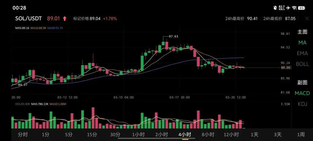 · 均线系统(短期粘合,尝试突破):价格目前围绕MA5(89.16)和MA10(88.98)上下缠绕,这是短期企稳的信号。虽然MA30(91.74)仍在上方形成压制,但价格已不再像BTC/ETH那样被所有均线压制。若能放量站稳91.5上方,有望扭转短期颓势。