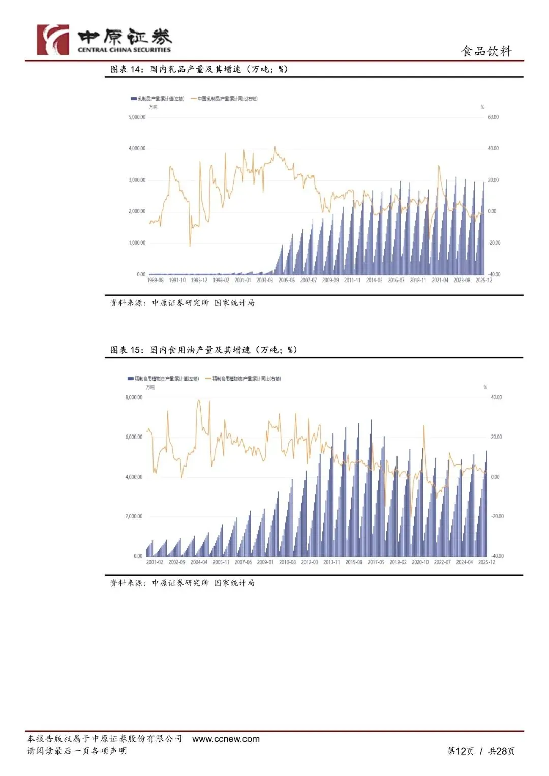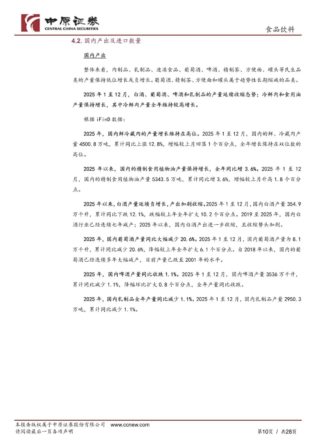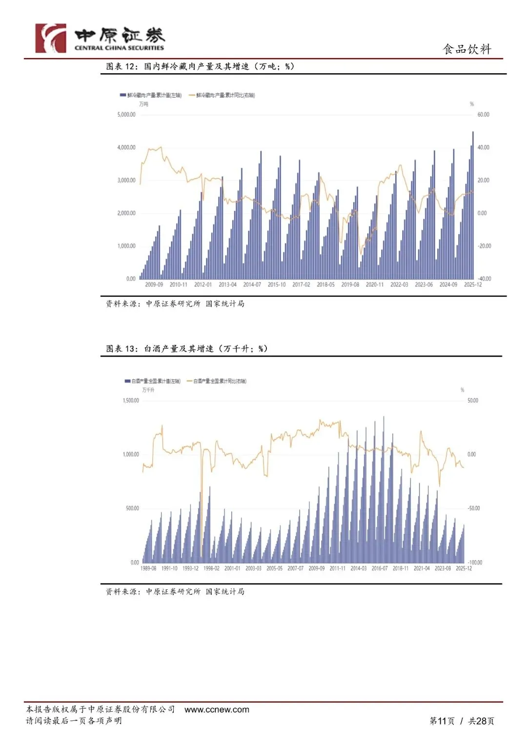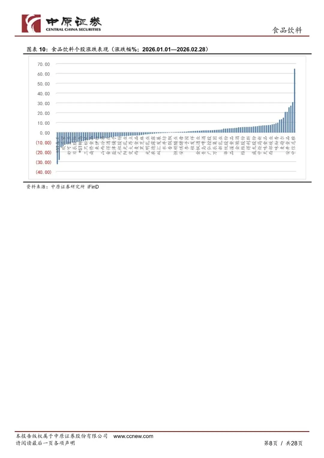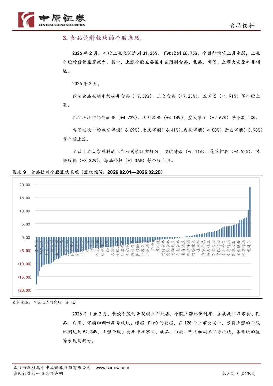 2026年2月,食品饮料板块延续微涨势头:熟食、调味品、预加工食品、肉制品和白酒延续上月涨势,啤酒板块反弹。板块成交量环比大幅减少,随着双节结束市场热度下降。2026年1至2月,食品饮料板块累计上涨1.24%,蒸食(+31.76%)、预加工食品(+10.78%)、啤酒(+6.28%)录得车校大涨幅。上年表现较好的板块当期下跌较多,板块呈现"高落低补"的市场格局。2026年1至2月,在31个一级行业中食品饮料的表现位居倒数第四,在消费行业中排名倒数第二,仅好于商贸零售、非银全融和银行。整体来看,2026年开年以来食品饮料的二级市场仍然表现较弱。