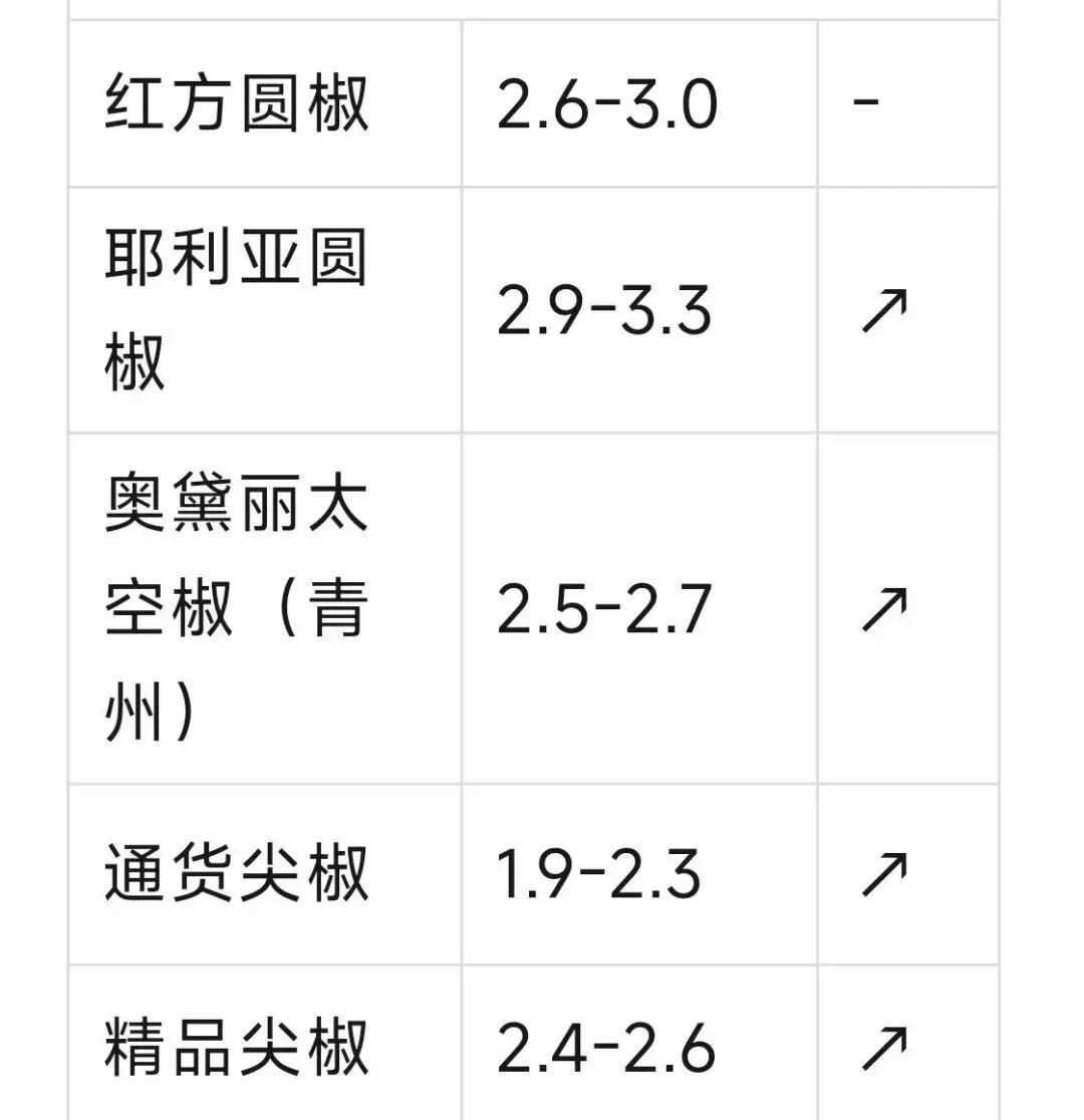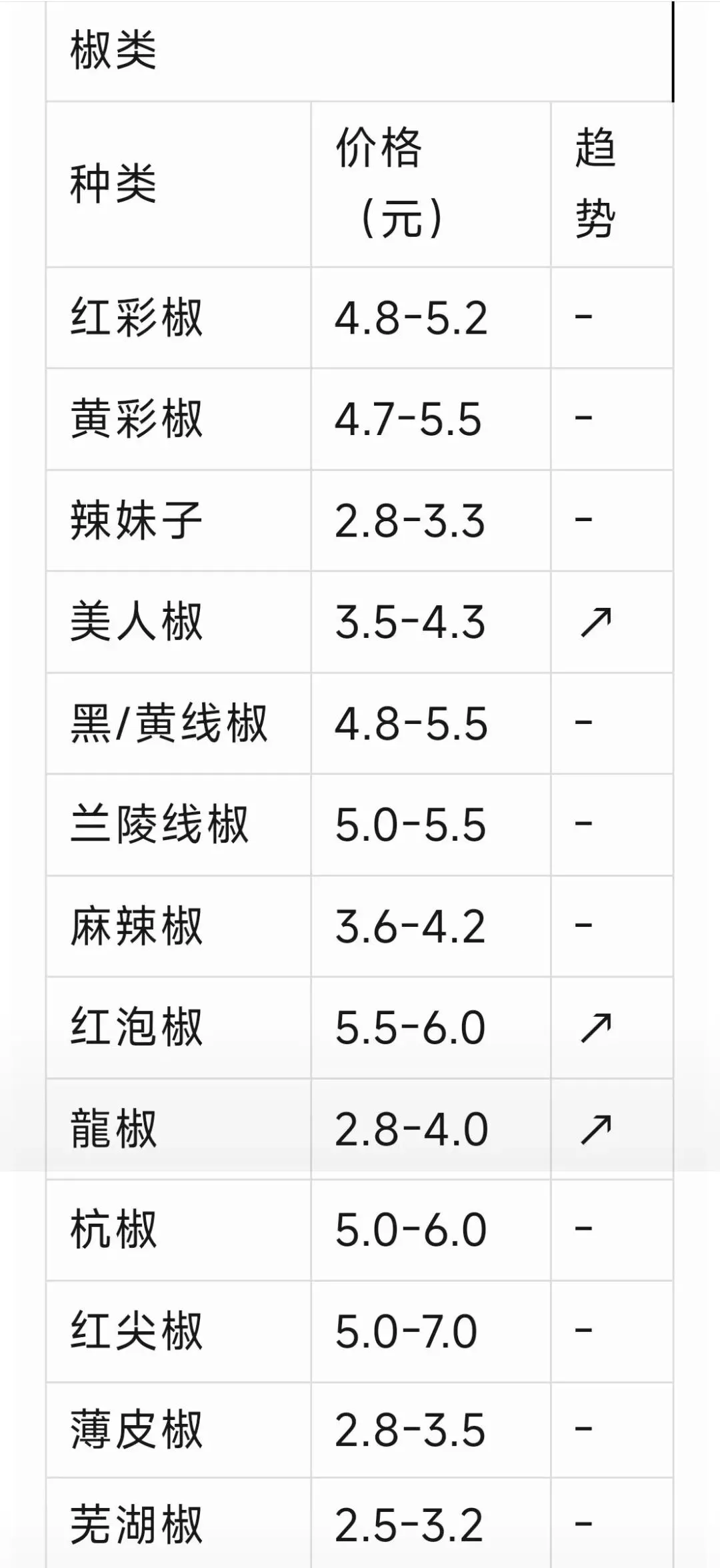 尖椒行情今日价格1.9-2.6元。青州太空椒今日行情2.5-2.8元左右。龙椒参考价2.8-4.0元,一般质量与精品价格差距较大,质量差距大。本地红彩椒4.5-5.2元,黄彩椒价4.7-5.3元,五彩椒行情都是先上涨后下滑!西红柿毛粉/硬粉参考价1.6-2.8元左右。