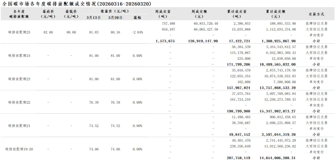 2026年1月1日至3月20日,全国碳市场碳排放配额成交量18,728,482吨,成交额1,404,774,601.50元。