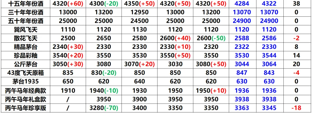 生肖茅台:丙午马年经典款保持在1936元;礼盒款均价维持在3938元;珍享版马茅下跌18元至3345元。