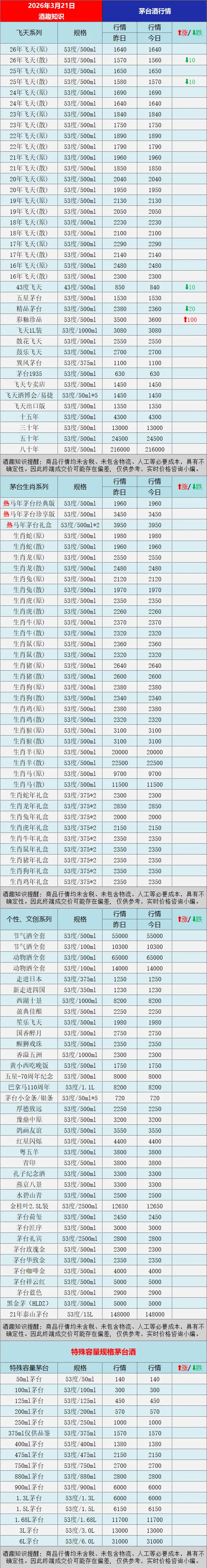 3月21日茅台酒行情:飞天下跌,彩釉珍品涨幅达百元