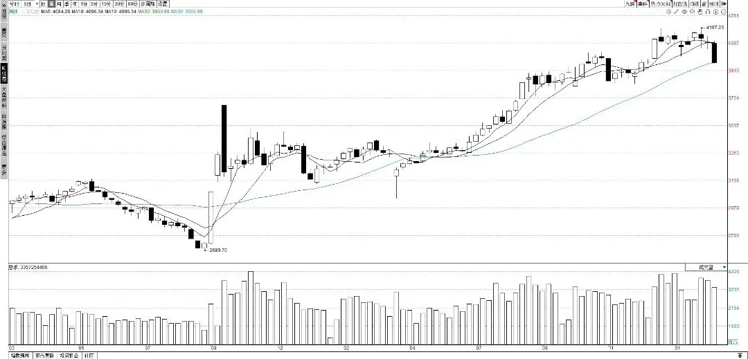 上证指数本周持续调整,最高上摸4108.4点,周五午后大盘跳水,跌破4000点大关,最终以接近全周最低点3957.05点报收,这是今年最低收盘位。不仅跌破4000点,还跌破半年线,同时也补掉了1月5日出现的3977.54-3983.58点跳空缺口。上证指数周K线收出大阴线,本周下跌3.38%,周K线3连阴,本周是跌幅最大的一周。
