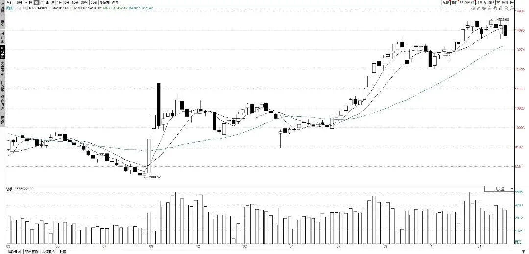 深市本周表现强于沪市,深证成指周四跌破14000点大关,当天最低跌至13852.6点,也是本周最低点,周五报收13866.2点,跌破13900点。深证成指周K线收几乎出光头光脚的小阴线,本周下跌2.9%。