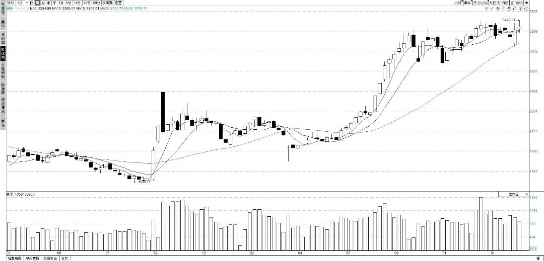 创业板指数本周表现最强,在主要指数中,是唯一收阳上涨的指数。周五上涨1.3%,盘中最高上摸3426.61点,创出今年新高,也是4年多新高。创业板指数周五报收3352.1点,周K线收出小阳线,本周上涨1.26%。