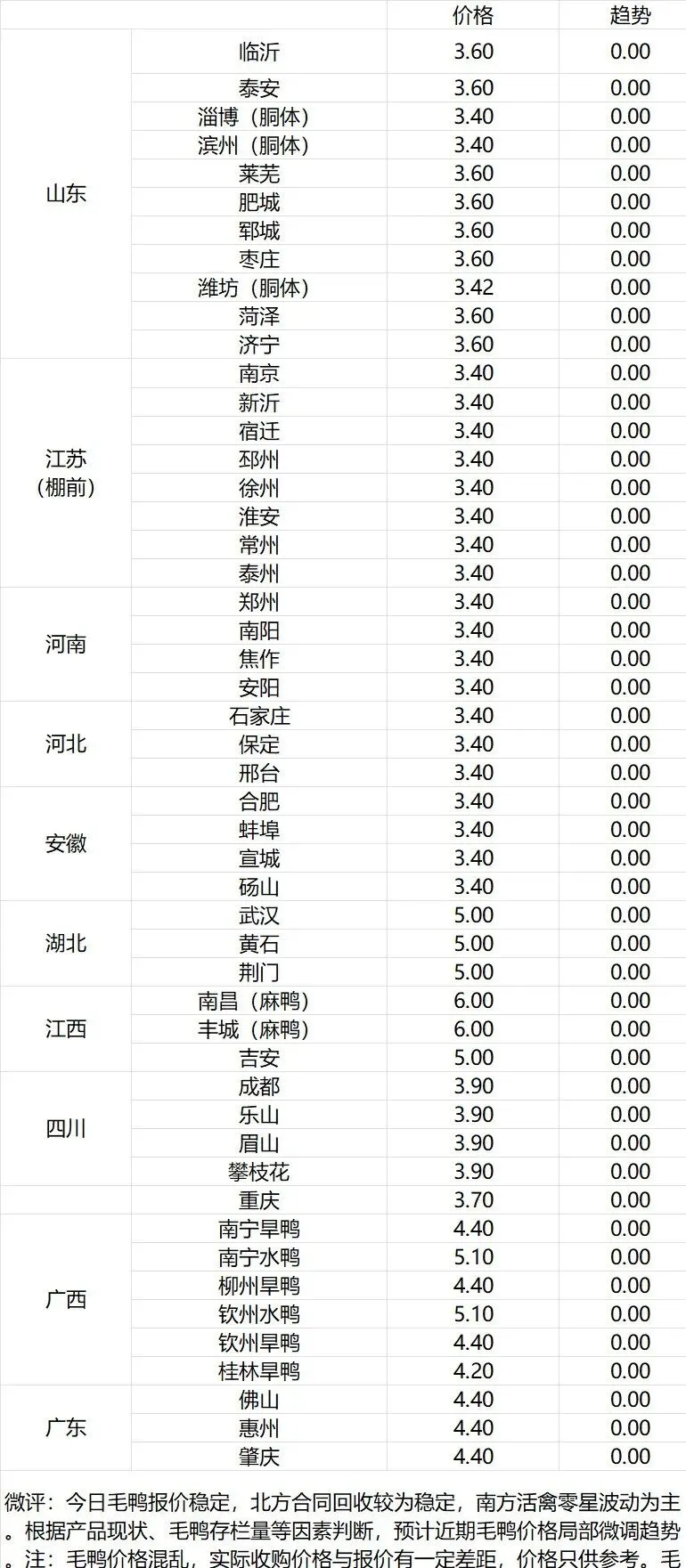 微评:鸭苗报价下跌。(注:南方只报当天价格)苗量少,计划紧张,养殖端成本高企,合同发放量控制。根据产品、养殖成本及鸭苗现状分析,预计近期鸭苗价格呈震荡走低趋势。种蛋报价落5分。温馨提示:该价格为主流厂家报价,实际销售价格以成交价格为准,价格仅供参考。