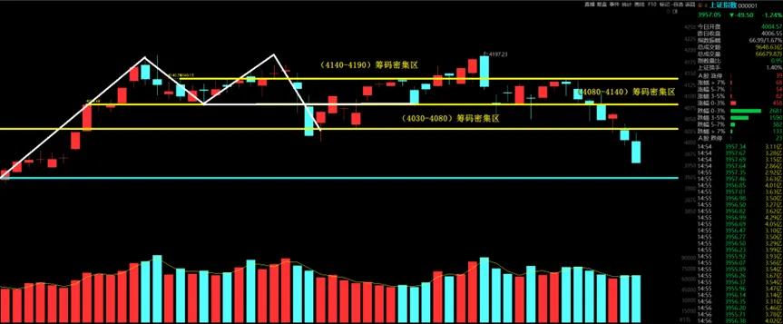 目前行情从下往上,要闯三个重压区:4030-4080、4080-4140、4140-4190。越往上,抛压越重。 2.4万亿的量能,根本拿不下来。