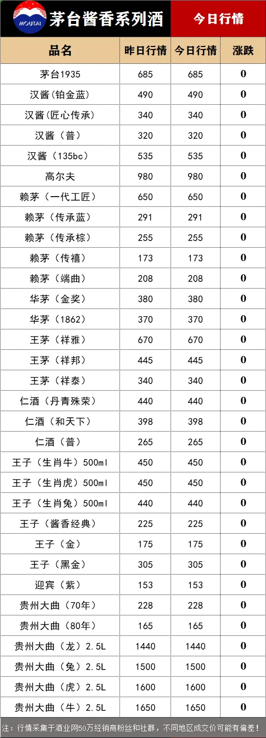 今日(3月21日),从酒业网发布的白酒价格行情监测数据显示,今日茅台酒行情价: