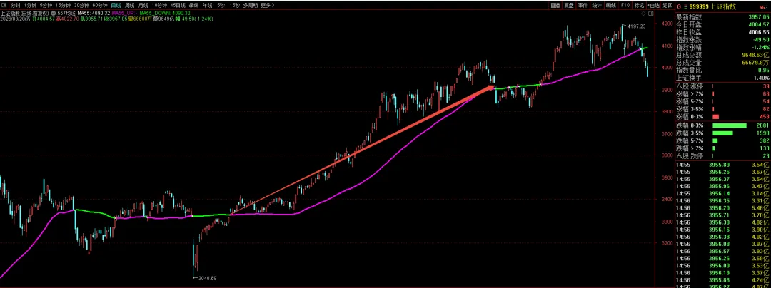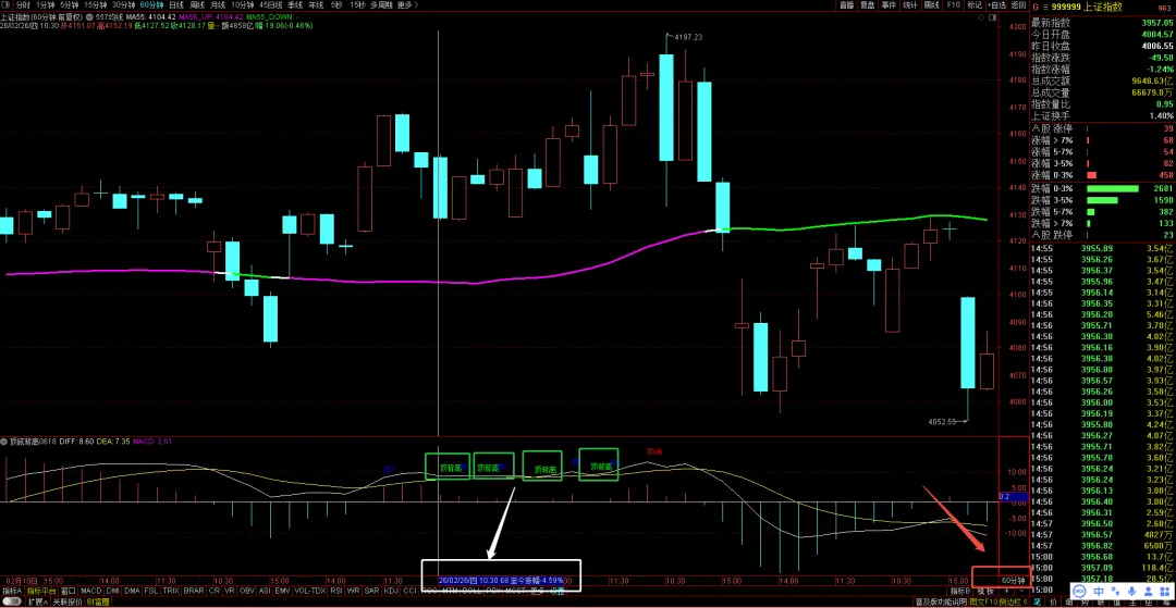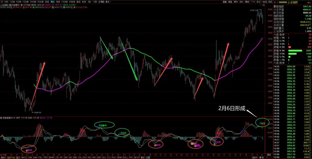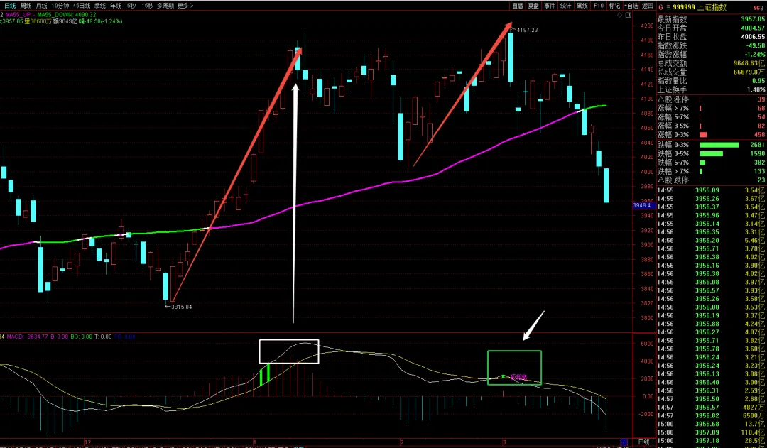 2026年元旦后功败垂成的“十八连阳”,价格也是持续新高,MACD能量柱到达峰值后,开始“盛极而衰”,单边走完,就要走震荡了。后面再上升不加速,就是上升阶段从“鼎盛”到“衰退”,于是乎,上证指数在3月3日如期创出4197的反弹新高后,同时伴随着日线的“顶背离”信号出现,进入到风险阶段。“顶背离”就是上升趋势的鼎盛到衰退;同理,底背离,就是下跌趋势的鼎盛到衰退。