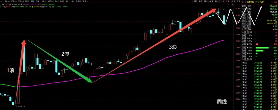 第一,上面已经说了,周线的4浪在相对高位,他是建立在3浪主升之后,一旦行情不能再延续强势,就要有方向上防范的思维。
