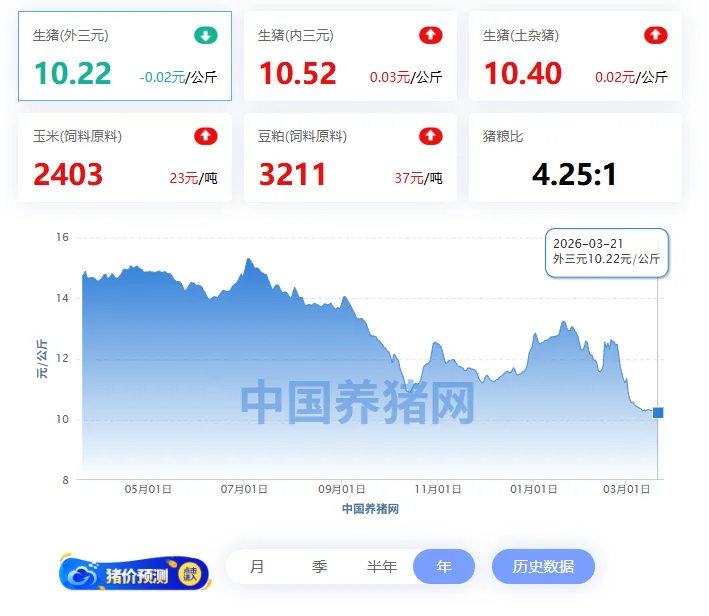 2026年3月21日全国外三元均价10.22元/公斤,今日猪价较昨日报价下跌了0.02元/公斤。
