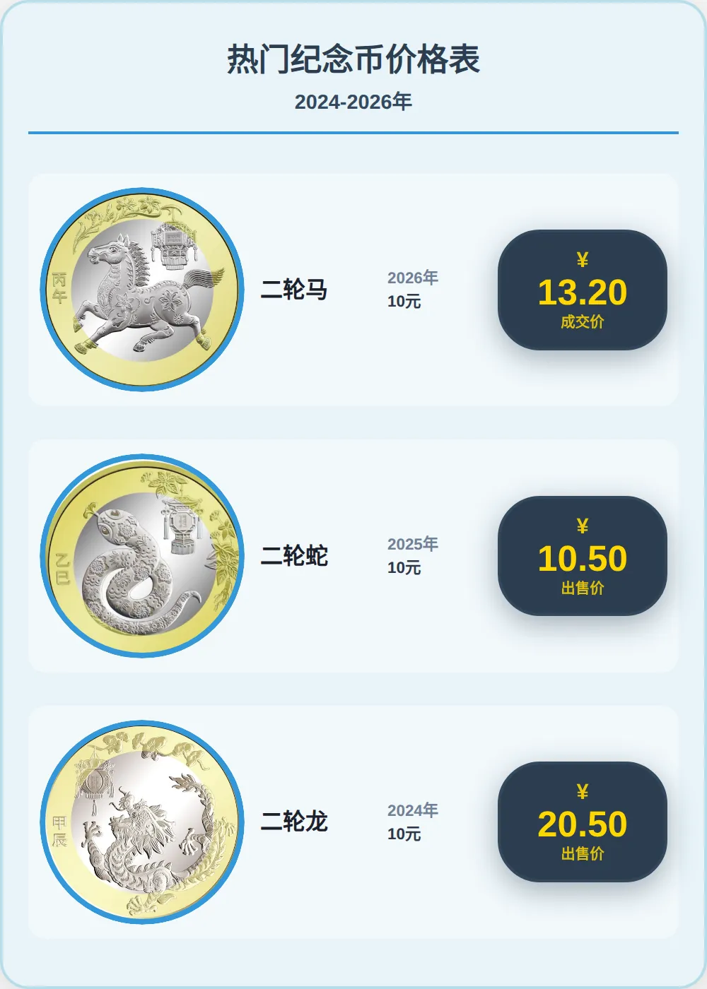 3月21日,纪念币市场行情比较惨淡,不只是成交量,价格也是处在低位。先看二轮生肖这边。二羊还是当之无愧的领头羊,现在卖价在30.5元左右;二龙紧随其后,20.5元能拿,虽然龙比发行晚,但题材可是最好的。接下来的梯队里,二虎成交价15.2元,二马13.2元,二兔则是12.5元附近。再往下的二牛挂11.1元,二猪11元整成交。剩下的几个品种基本就在10块出头打转:二鼠10.5元,二蛇和二狗都是10.5元,二猴10.4元,二鸡稍微低点,10.2元左右。再瞧瞧热度挺高的京剧系列。生角目前卖11.1元,这可能最近几年溢价最高的纪念币了,其他两枚就差多了,旦角跌到了6.4元,净角则是5.5元。贺岁系列跨度就比较大了。老大哥一轮贺岁羊依然坚挺,卖价90元;一轮贺岁狗30元,一轮贺岁鸡28.5元。往后排,一轮贺岁猴25.5元,一轮贺岁鼠23.7元,一轮贺岁猪18元。至于近几年的品种就比较亲民了:一轮贺岁牛6元,一轮贺岁兔5.85元,一轮贺岁虎5.5元,贺岁龙目前5.2元就有成交。