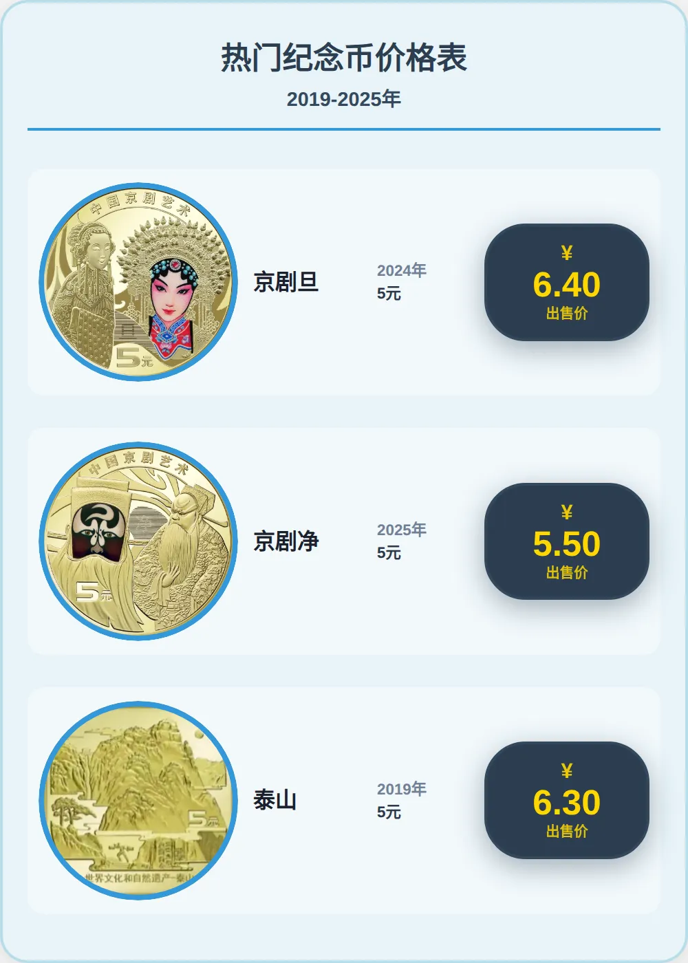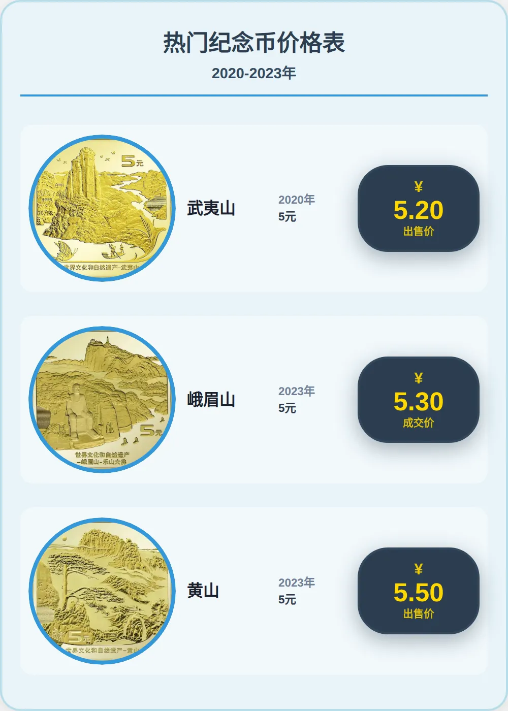 双遗产系列波澜惊,泰山最贵,挂6.3元;黄山5.5元,峨眉山5.3元成交,武夷山5.2元。