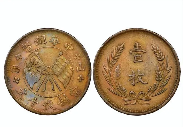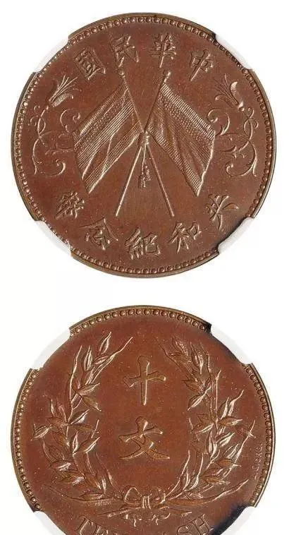 图中这枚铜板叫中华民国双旗纪念铜元,小时候爷爷装进他的小木匣子,说这钱摸着才带劲,手感比纸票都厚实,这货铜色偏红,表面还泛着一层温润的老光,正面一对交叉的旗杆扎得直溜溜,旗面上头一面五色旗,另一面团团的,旗角翘着,那行字写得圆润,带点老北京腔,边上还打着小齿,边儿摸着不咯手。