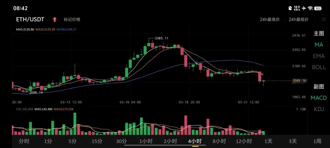 · 相比BTC,ETH走势更弱,价格已明显脱离均线压制区域,处于加速探底阶段。