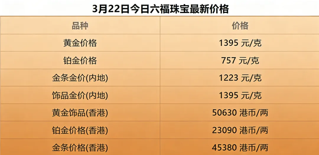今天六福珠宝公布了最新金价,内地的黄金饰品价格来到每克1395元,金条价格是1223元,两者之间相差172元,而铂金的标价为每克757元。