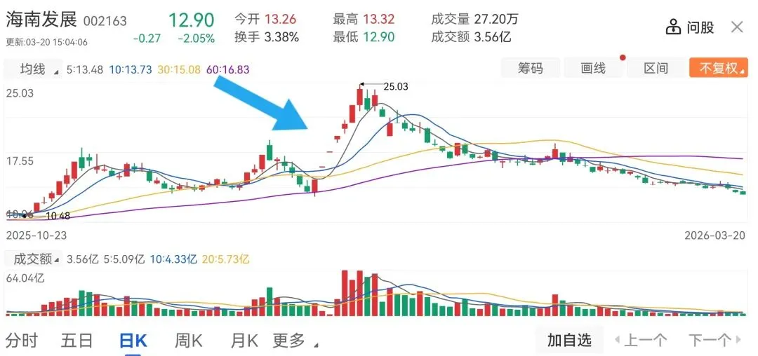 海南发展,去年12月19日开始,因为海南自贸区概念,被爆炒了一波,10个交易日,股价从12.66元涨到最高25元,接近翻倍。