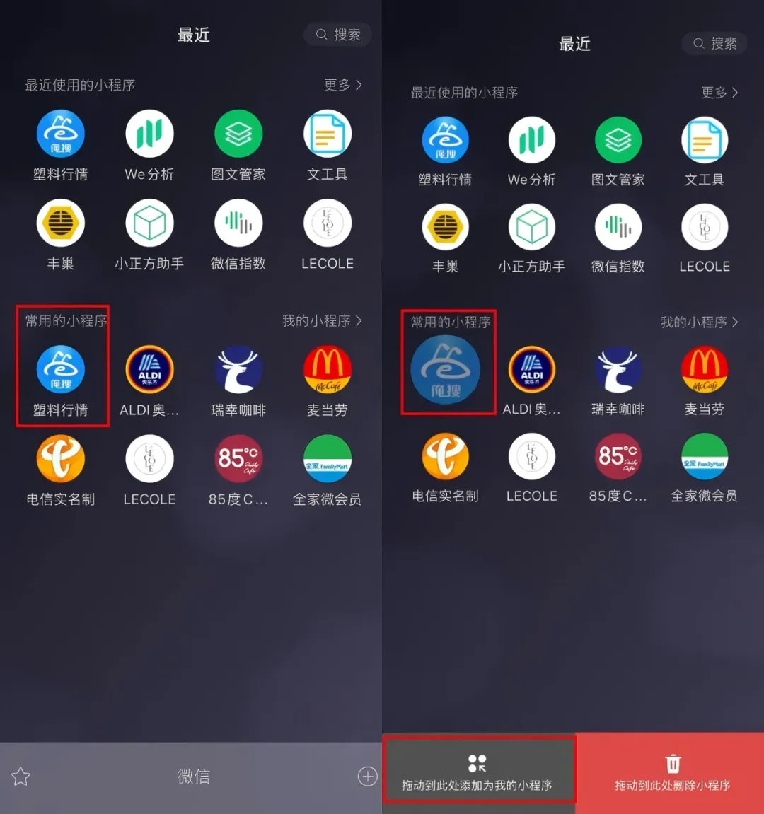 现在在微信聊天页面下拉对话框,就能够轻松拖动我们的小程序——添加为我的小程序,方便下次使用!