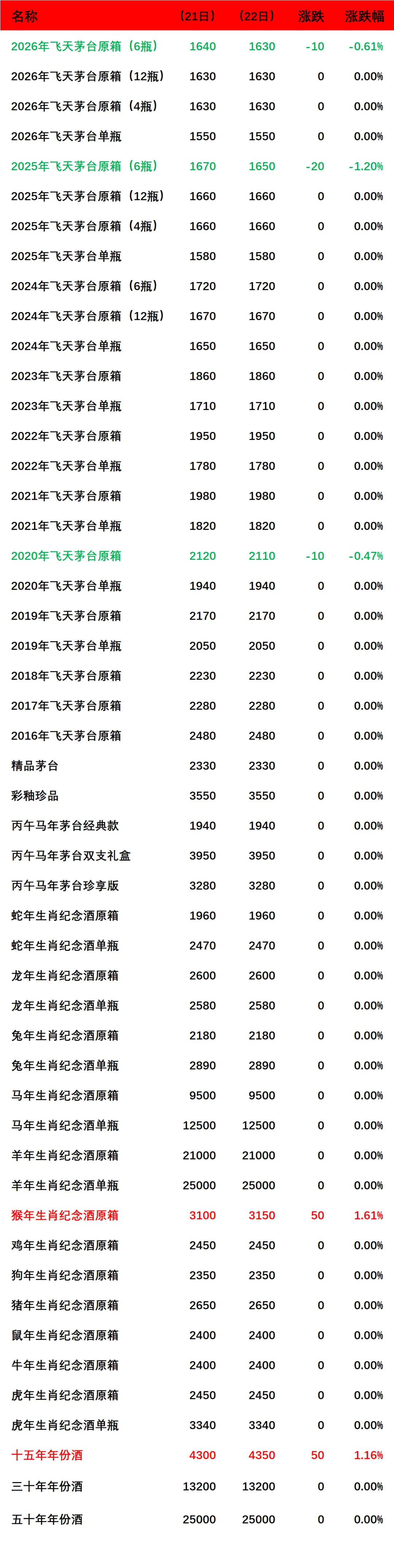 2026年飞天茅台原箱(6瓶),2025年飞天茅台(6瓶)原箱,2020年飞天茅台原箱下跌;
