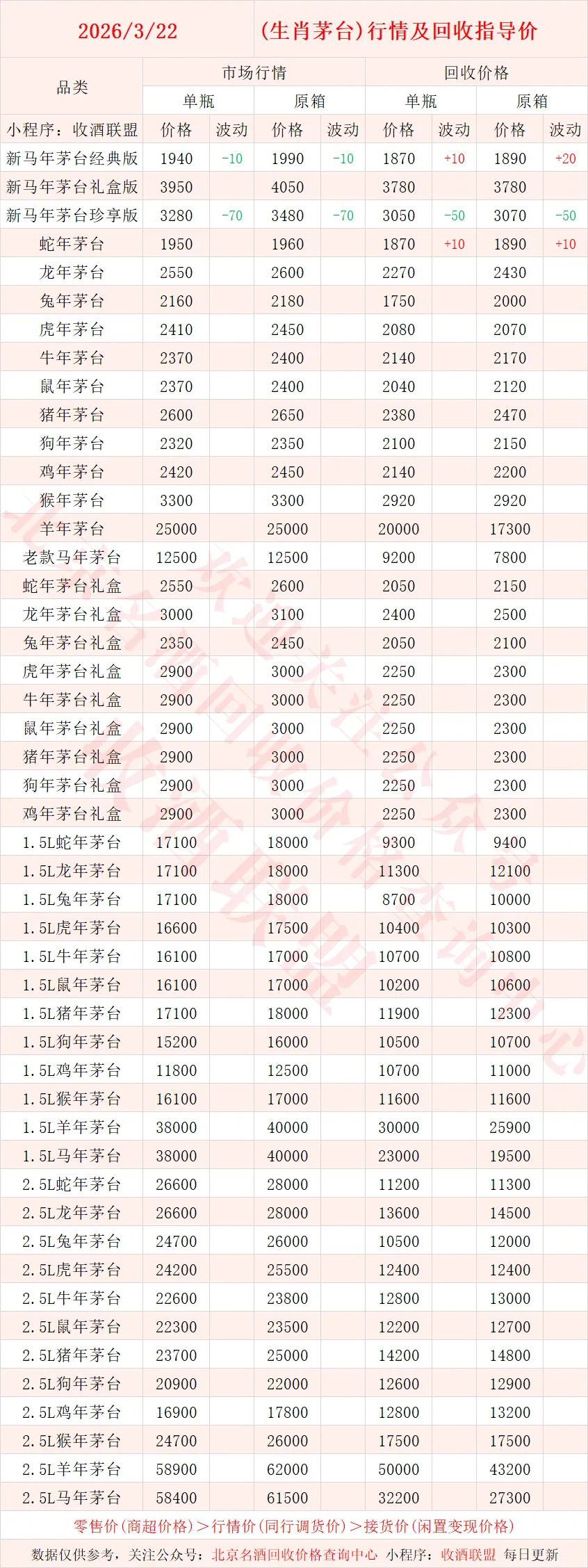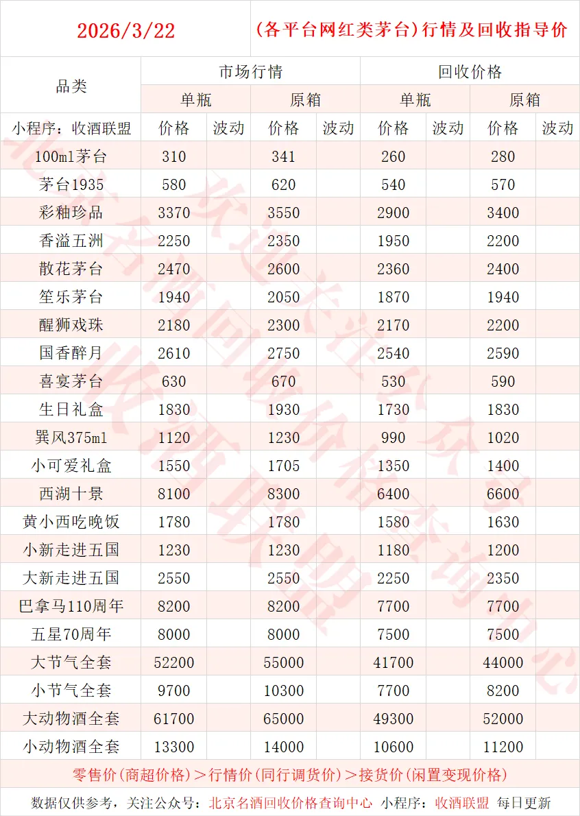 以下内容为,本公众号每日会及时更新的飞天茅台、生肖茅台、年份茅台,陈年茅台及不同毫升容量茅台的市场行情和回收报价;还包含五粮液、汾酒、剑南春、泸州老窖等国产名酒的行情及回收价,法国拉菲、木桐、玛歌等名庄红酒的回收报价,轩尼诗、马爹利、人头马等世界知名洋酒威士忌的回收参考价,每日整理不易,请点击关注支持。▪畅销类茅台行情及接货参考价▪