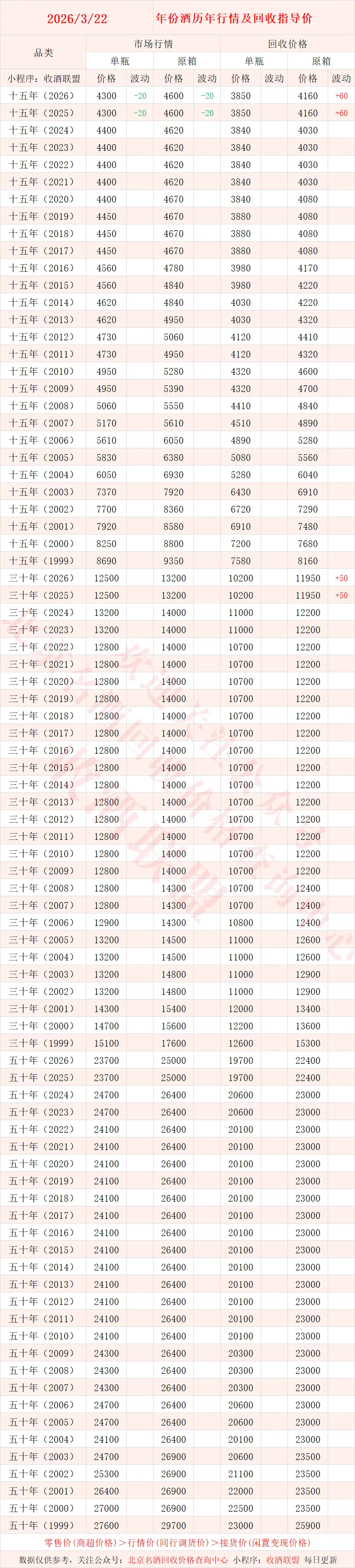 北京名酒回收价格查询中心,联系电话15652897909【同微】,专注于名酒回收行业的综合服务平台!是北京市价格认证中心、天津市价格认证中心的特聘专家,从业多年积累了各种名酒真伪鉴别经验,拥有多名品酒师、鉴定专家!累计服务数十家各省市价格认证评估,旗下小程序 “收酒联盟”,提供一键查酒价,不仅能一键查询各种名酒的价格,而且每日都会及时更新,保证你看到的都是新的准确行情。直接面向大众提供老酒,红酒,洋酒等真伪鉴定回收变现服务,回收价格专业靠谱!经过十余年磨砺,在全国100余座城市、四千多家业务会员酌情提供上门回收,是名酒回收行业中的翘楚!