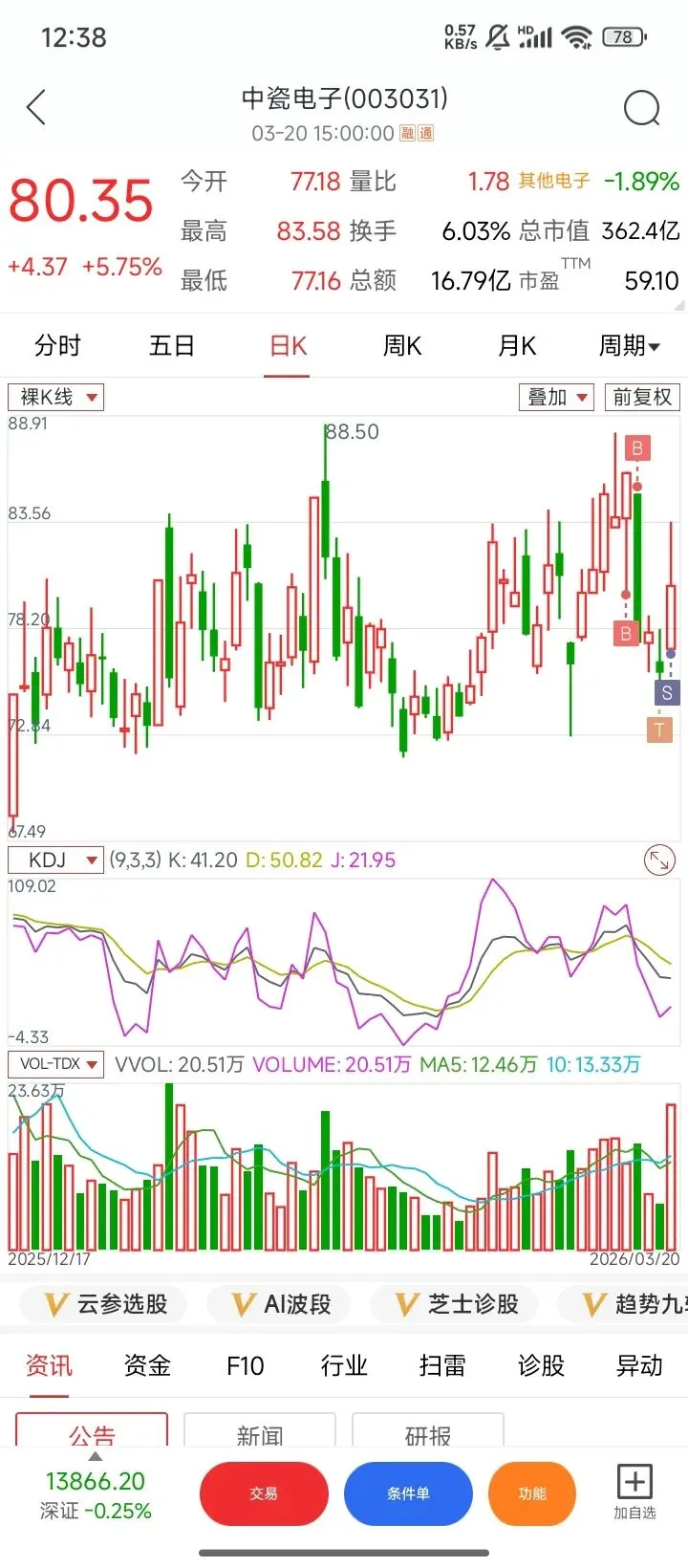 像中瓷电子买入的时候是赚钱的,第二天跌了九个点,加仓让成本来到了83.51块,所三天第四天继续跌跌,没想到周五他来了个涨停,在涨停全部卖掉了。亏损3块钱。