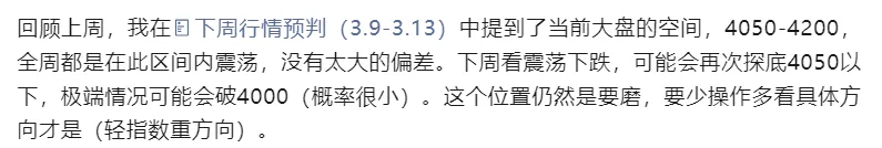 做了判断,本周也是如期下跌,甚至比较极端的跌破了4000。可以回顾过去几周的指数预判,大体上都是能够符合判断的。当前的行情是系统性的,很多时候并非逻辑错误。我们讲市场永远是对的,非要逆势强行做,那就是你的错了。