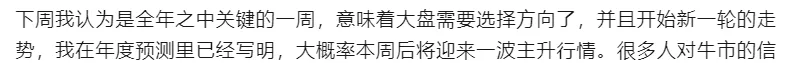 鉴于本周的特殊性,我也是提前拉了近期点赞较多的几位朋友,分享了操作策略进行布局(以后打算每月拉几个点赞、再看比较多的朋友进群)。根据我的交易体系,我认为这里是非常值得博弈的,或者说性价比是非常高的点位,不论是空间还是时间,都到了。后面就看具体走势吧,下周我认为会是震荡上升趋势,而且周一极大可能是低开高走。当然,我不可能做到百分百的正确,但交易体系到了买卖点无论如何我也会按计划去执行,修正体系是事后反思才应该做的。