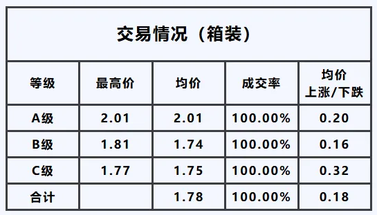 B级——最高价2.22元/枝,均价较昨日,下跌0.02元/枝;