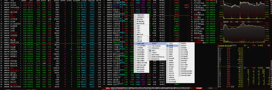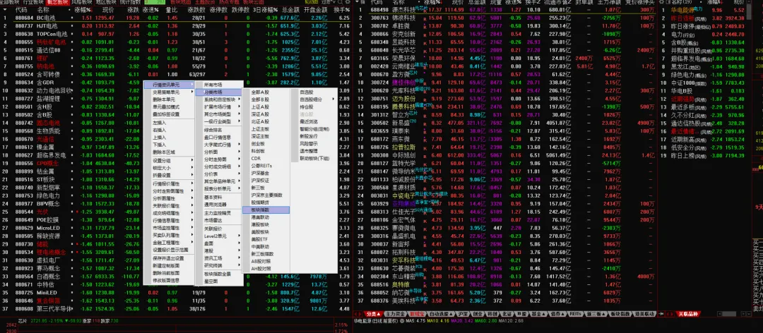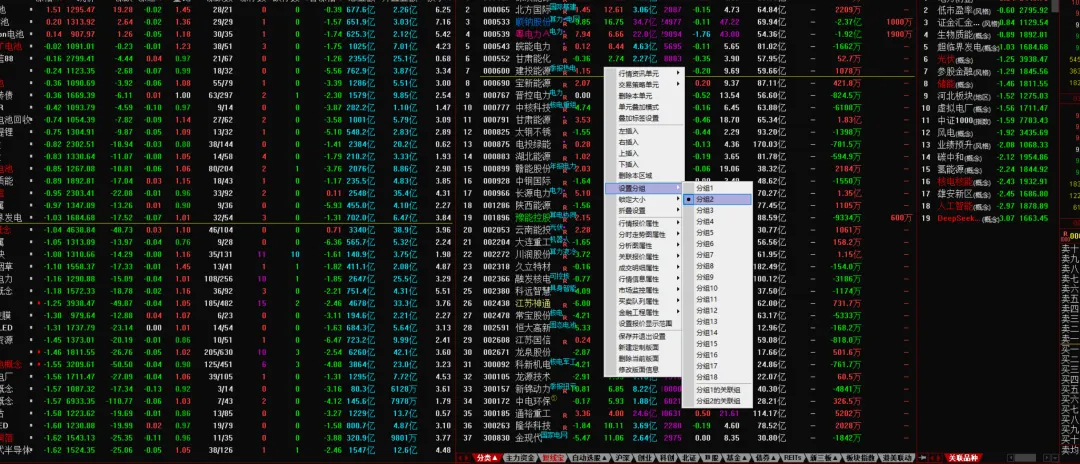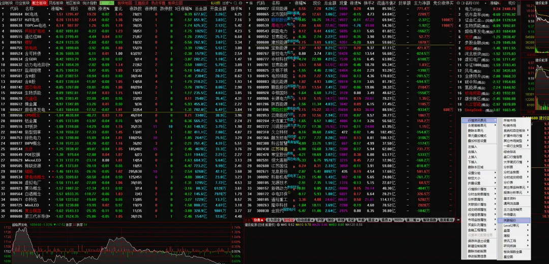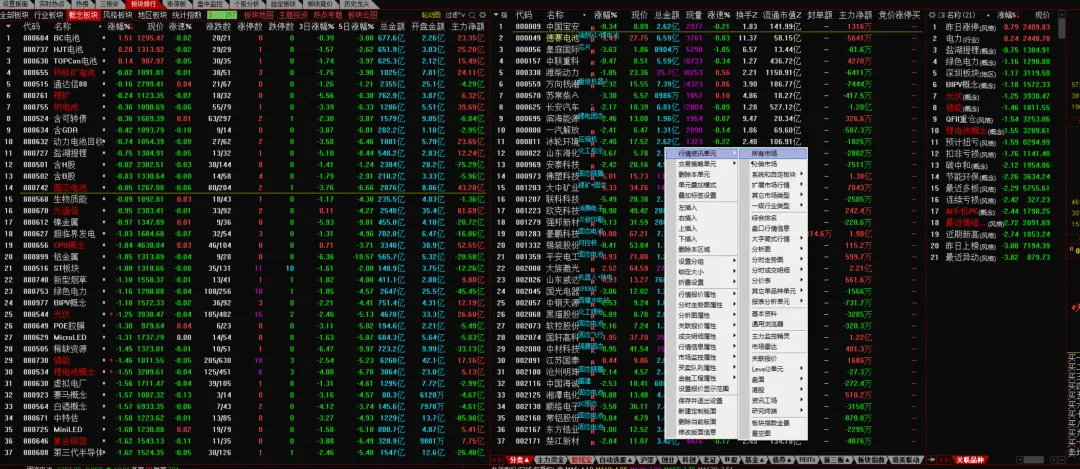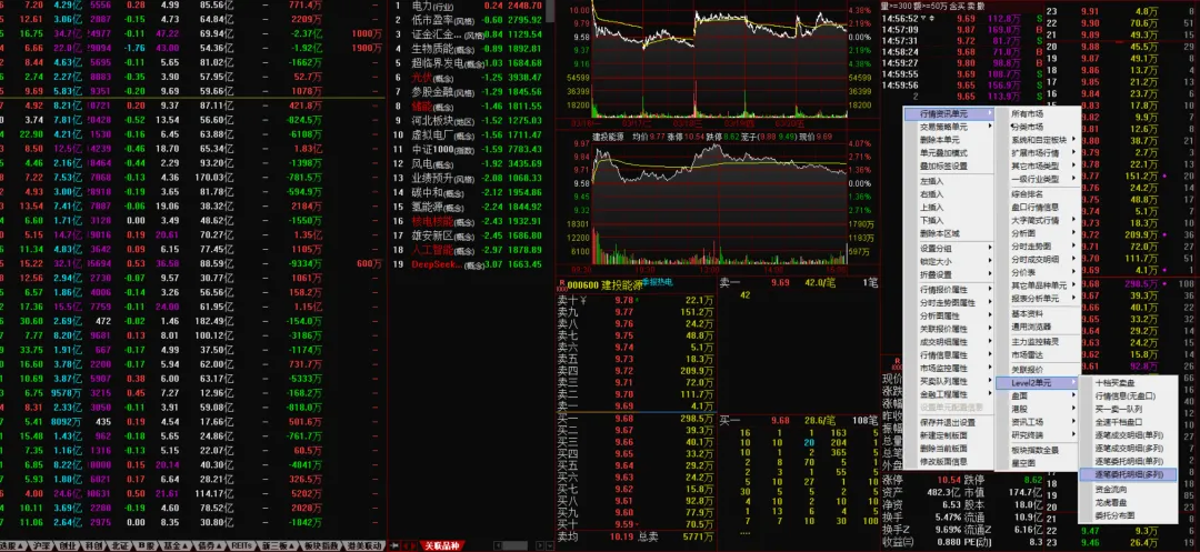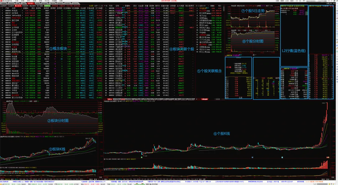 概念关联个股、个股关联概念、个股对应分时图、个股对应K线图十档买卖盘、买一卖一队列、行情信息、主笔委托明细、逐笔成交明细、全速千档盘口可以参考上图对界面进行一个划分。界面的布局是一个参考,具体可以根据自己的喜好,灵活划分。分时图:右键→行情资讯单元→分时走势图→普通分时走势图1、板块、个股分时和K线,需独立设置分组才能分开显示,如何设置看下文。2、个股5日线分时的设置,是在分时图的基础上,按Alt+5右键→行情资讯单元→Level2单元→对应L2菜单个人常看的是这么几项:十档买卖盘、买一卖一队列、行情信息、主笔委托明细、逐笔成交明细、全速千档盘口对板块内个股进行排序,一般是按涨幅排序,方便快速查看领涨个股。