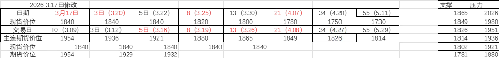 首先我们回顾一下从2025年10月13日的现货1470元,10月16日期货1577元的底部,现货历时155(144+11)天到3月17日1840元,上涨370元,上涨比例25.17%。期货历时94(89+5)个交易日到3月9日1954元,上涨377元,上涨比例23.9%。个人认为反弹的第一阶段结束,已经进入回调阶段。回调的时间周期与价格预测见下表:(个人分析,仅供参考)