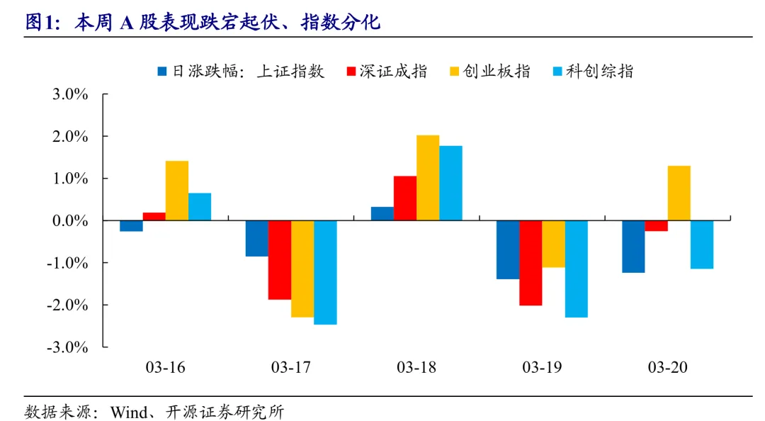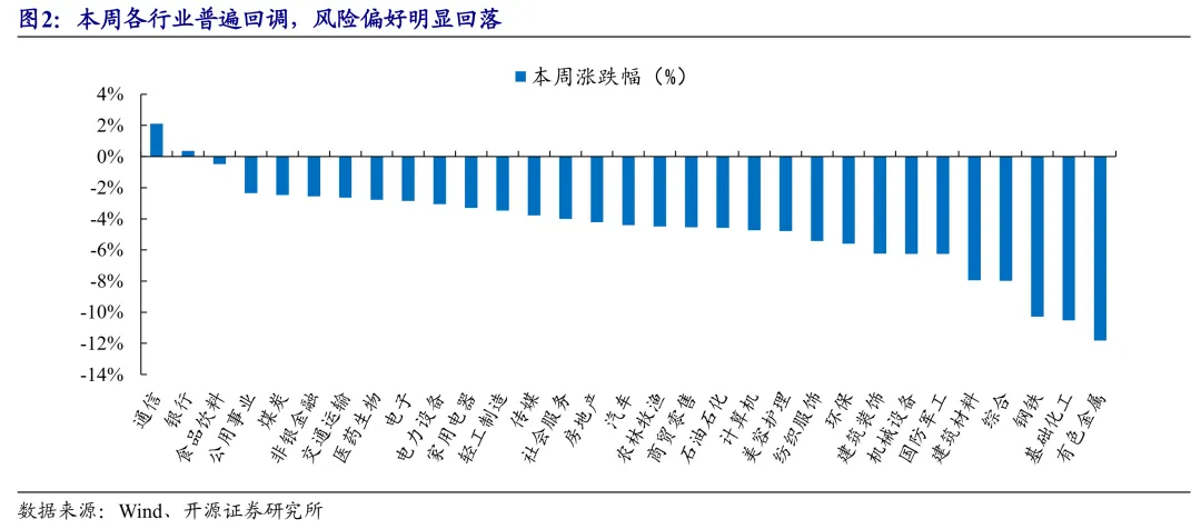 本周市场指数表现分化,上证指数、深证成指、创业板指、科创综指周涨跌幅分别为-3.38%、2.90%、1.26%、-3.51%,日均成交量为2.21万亿元,较上周缩量约2876亿元。行业方面,除通信、银行小幅收涨外,各板块普跌,有色金属、基础化工、钢铁等周期方向领跌。
