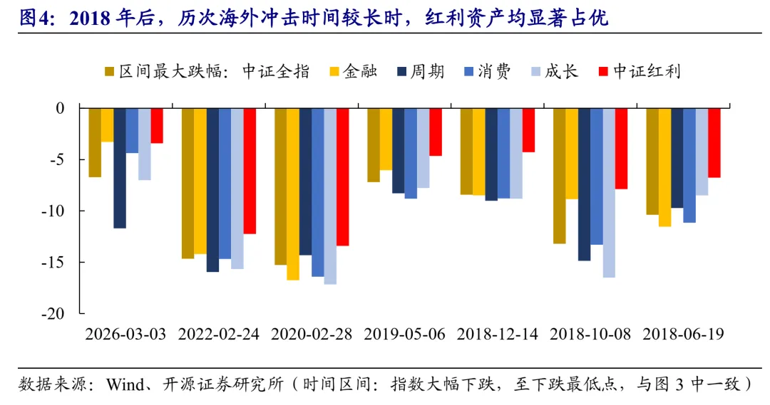 以2020年2月新冠疫情与2022年2月俄乌冲突为例,中证全指的最大跌幅分别为15.28%与14.66%,同期中证红利的最大跌幅分别为13.4%和12.23%。本轮中东冲突中(2026年3月3日-2026年3月21日),中证全指和中证红利指数最大回撤分别为6.70%和3.4%。