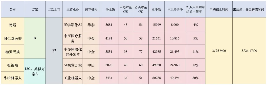 - 冷门:其余 3 只5 只均周三早间截止,时间充裕,优先布局华沿机器人和极视角,中签难度都不大。