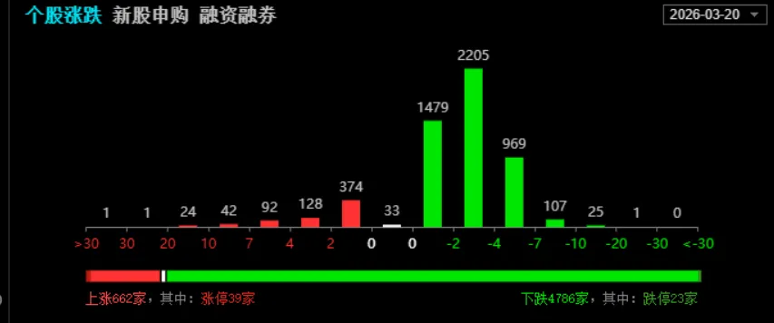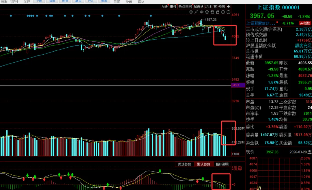 回顾周五指数,沪指早盘平开低走,整个上午盘围绕4000点保卫战进行,午后开始单边下跌,最低收至3957.05点,创业板指则是一度再创历史新高,收涨1.3%、全场再次超4700家下跌。全天662家上涨,4786家下跌,49家涨幅超9%,117家涨幅超5%,43家跌幅超9%,492家跌幅超5%,整体亏钱效应爆棚。截止收盘,沪指收3957.05 跌1.24%,深成指收13866.20 跌0.25%,创业板指收3352.10 涨1.3%,两市成交2.28万亿,较前一日有所放量。板块方面,,盘面光伏设备,电力,电池,高股息,银行等相对强势,其他行业全面普跌。领跌方向,算力,华为昇腾,通信服务大跌超4%,整个软件应用端全面回调。光伏设备:上能电气,首航新能20cm,锦浪科技, 海优新材,昱能科技涨幅超11%,永臻股份,正泰电源,国盛科技,禾迈股份,艾罗能源涨停电池:华宝新能,鹏辉能源涨幅超10%,石大胜华,豪鹏科技涨停电力:九州集团涨幅超13%,东方新能,兆新股份,银星能源,华电辽能,韶能股份,广西能源涨停光伏概念:格利尔,海优新材,铭利达涨幅超10%,大胜达,中利集团,云南锗业涨停自三月以来,A股市场,没有一天是具备像样的走势,连续两周单边下跌,周线三连跌,从4197点到现在的3957点,跌掉了254点,最重要的因素就是美伊战争导致全球资本市场大跌。从2月以来美股纳斯达克则是连续跌了近2个月,交易难度相当大。从中证1000和中证2000角度分析,这一轮下跌基本都是围绕题材性杀跌,因为这些地方基本都被量化包圆。受伤的自然也是散户从周五这波分时图走势来看,资金其实也是在等待消息面上是否有一定的缓和,但到了周五时间窗,一旦没有发现跟进资金发生异动,那么量化自然就会被动卖出,从而形成情绪上踩踏,因为资本也是害怕黑天鹅的 再一次加剧。1.美股纳斯达克周五晚间大跌2%,创去年11月份以来新低,欧洲股指也是全线大跌,预计明天再次低开是跑不掉了。2.伊朗方在下午14时发文,允许非敌方船只通过霍尔木兹海峡,由此主要观察明日9是国际期货,原油的波动 情况,一旦原油下跌,对于资本市场是属于积极性的。3.中国AI大模型周调用量达到4.69万亿Token,对于算力方向刺激较为明显,就看市场情绪买不买账。4.宇树科技IPO获受理,相关概念预计明日有所表现。技术面,从周五收线情况来看,收取的光头阴K,基本预示后市还将有一个低点形成,阶段性支撑位来自前期高低点突破位置3936一线,一旦直接性破位那么可能就会持续寻找3900的整数关口,量能,MACD都不具备指数迅速反弹的可能性,还需要大概2-3个交易日的收线形态。周线级别,则是市场在牛市行情中,每一轮中阴柱后面接下来就是1-2周的止跌企稳,正好周五也是收在30日线的位置,这个平台一旦能稳住,还是具备常规修复能力的。1.指数方面,明日大概率是要低开的,重点关注原油走势,该商品一旦低开低走那么直接会带动资本市场止跌企稳修复反弹;反之则是市场延续疲软走势。周一 市场一般是对周末消息面的一个落实阶段,也是大批量个股是否能在当前泥石俱下的情绪中进行被错杀的修复,因为实在跌太惨了,很多个股都是被动下跌。下周的上半周就是个股的整体修复态势,配合指数,如果持续疲软个股预计还会无量阴跌,如全球股指报复性反弹,那么个股也会常规修复,当前首当其冲的就是观察微盘股指数的走势情况,因为决定着大部分板块的走势,没有特别的预期,就是以走修复为主。