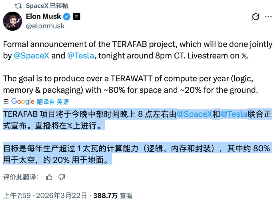 Terafab计划还没有正式落地,属于周末消息里叙事强度较强的方向,