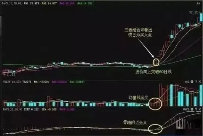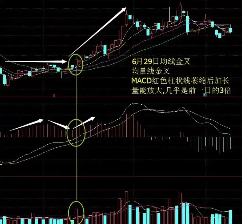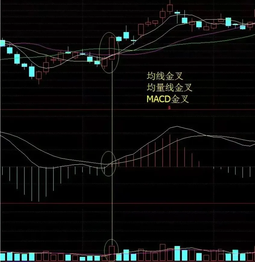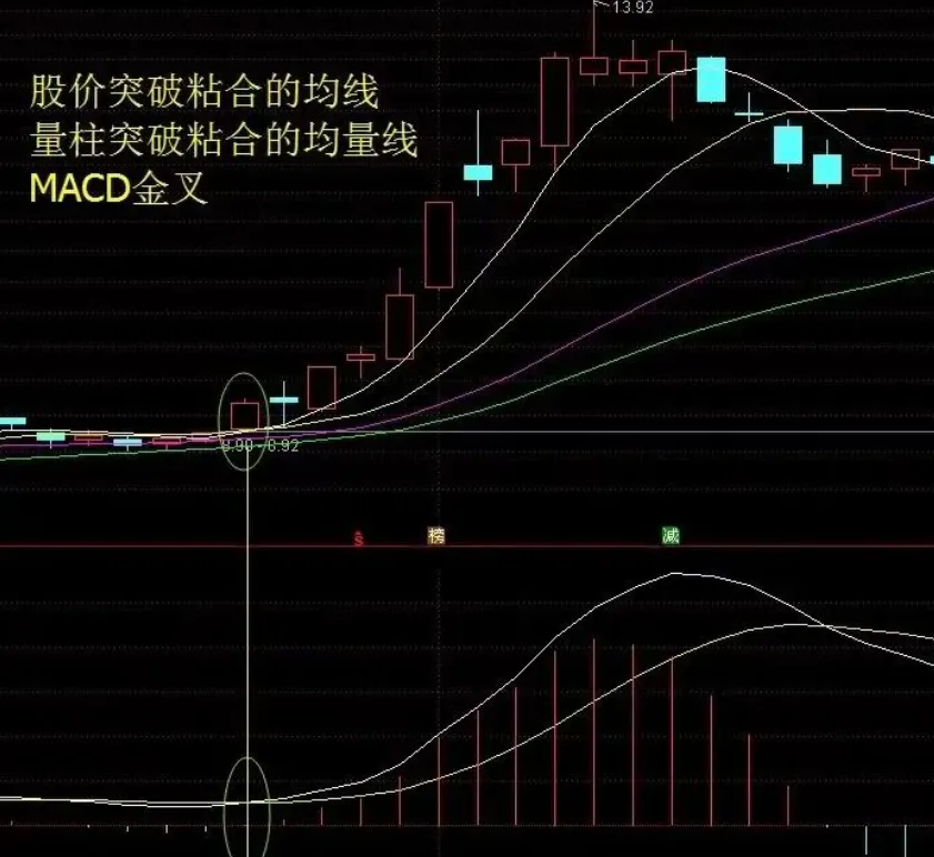 上图中,均线和均量线都处于粘合状态,当天开盘股价突破均线,量柱突破均量线,MACD金叉.