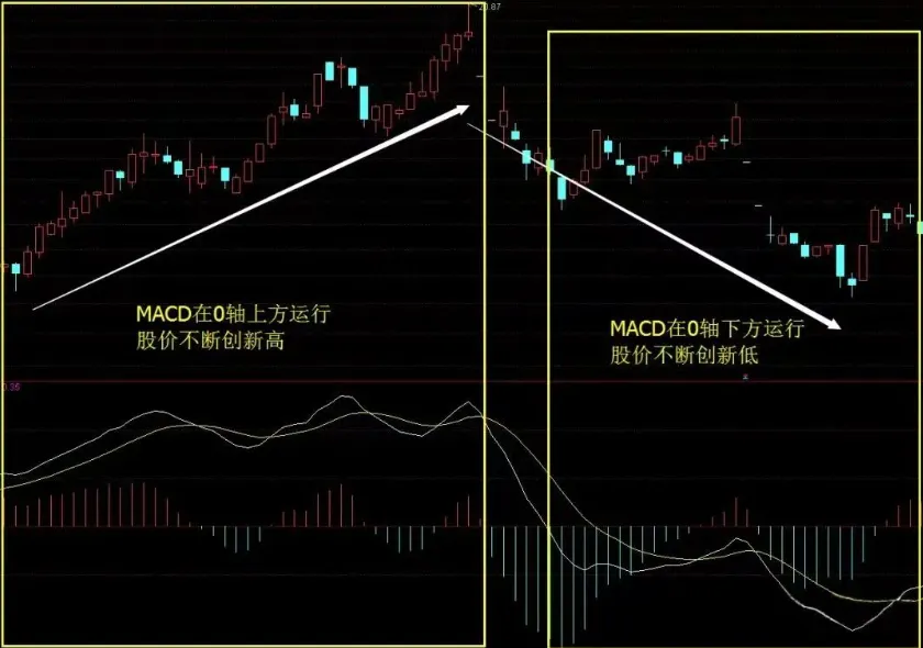 0轴上方金叉:多头趋势中的加速信号,为较佳买入点。0轴下方金叉:空头趋势中的反弹信号,提示短线机会(需谨慎,视为空头回补)。共性: DIF上穿MACD均构成短中期买点,但0轴上方信号强度与可靠性更高。MACD在0轴上方运行,股价不断创新高,MACD在0轴下方运行,股价不断创新低.如图: