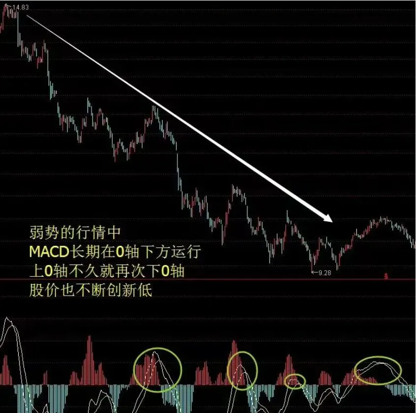 2.MACD在0轴下方——每发生一次死叉,股价将创新低。
