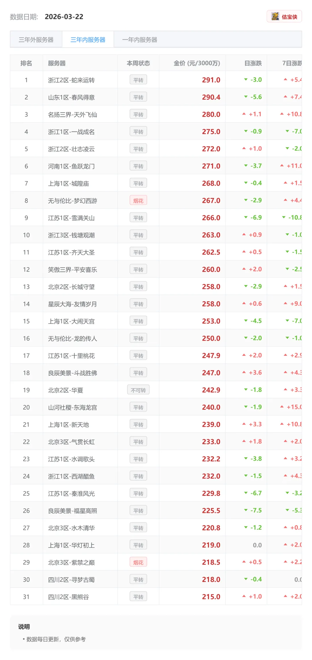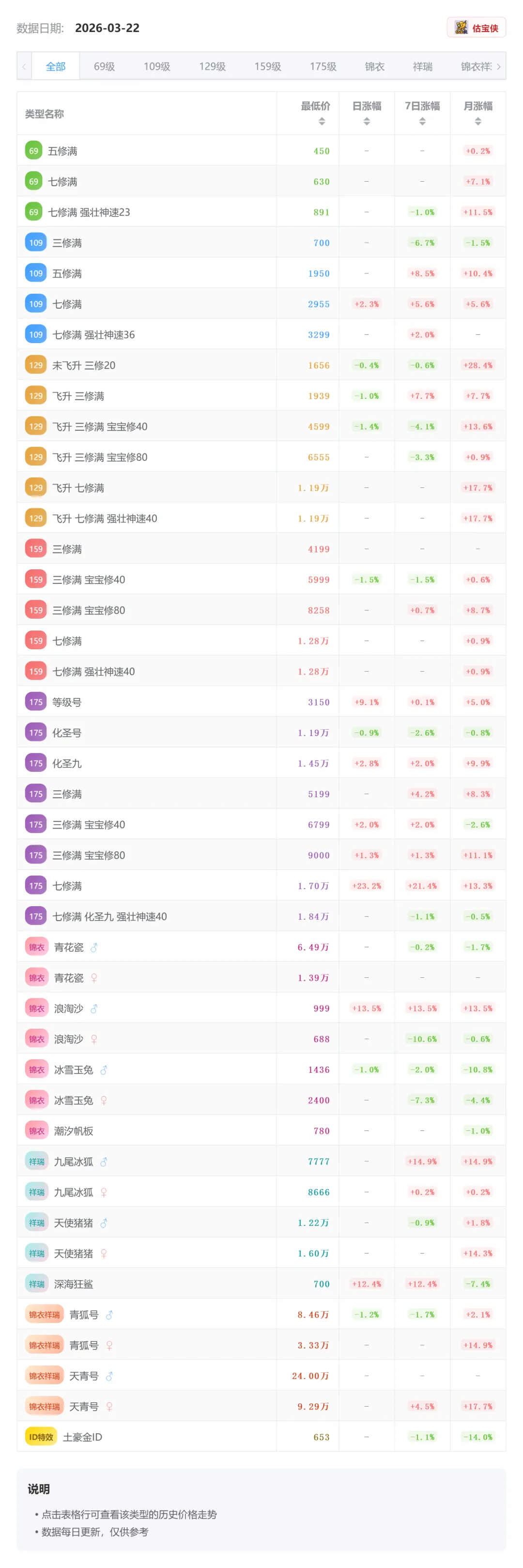 一、69等级段:整体趋稳五修满价格稳定,七修满维持高位,七修强壮号小幅回调(-1.0%)。整体来看69进入横盘期,波动不大。