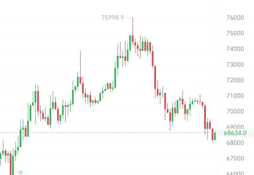 后续走势方面,价格大概率继续回调下行,若跌破近期低点68200,将进一步下探66000-67000支撑区间;若短线企稳出现反弹,上方70000-70500区间将受到30日EMA均线与布林中轨双重压制,突破阻力较大,整体依旧以偏空震荡下行为主,需留意行情继续下探中期支撑的风险。