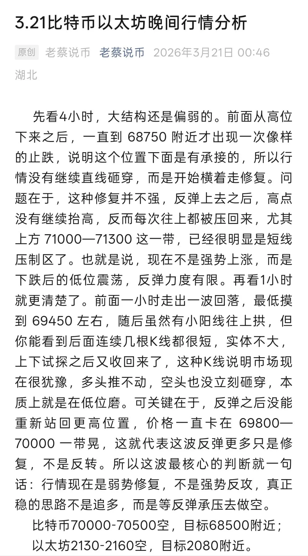 从结构上看,这一波行情已经明显走弱,四小时级别连续阴线下压,高点不断降低,低点也在下移,整体属于下行通道中的弱势震荡。前面从71000一带冲高之后出现长上影,说明上方抛压很重,多头没有延续能力,目前价格始终被压在布林中轨下方运行,趋势已经从强势转为空头主导。再看一小时级别,68030一带探底后虽有小幅反弹,但反弹力度很弱,多次上冲69000附近都被压回,说明这里只是技术性修复,而不是反转,目前更像是低位横盘蓄力,等待下一步方向选择。MACD虽然有收敛,但仍在零轴下方,说明空头结构还没结束。总结一句话:当前就是弱势反弹后的二次下探预期,高空思路优先,低多只适合短线快进快出。