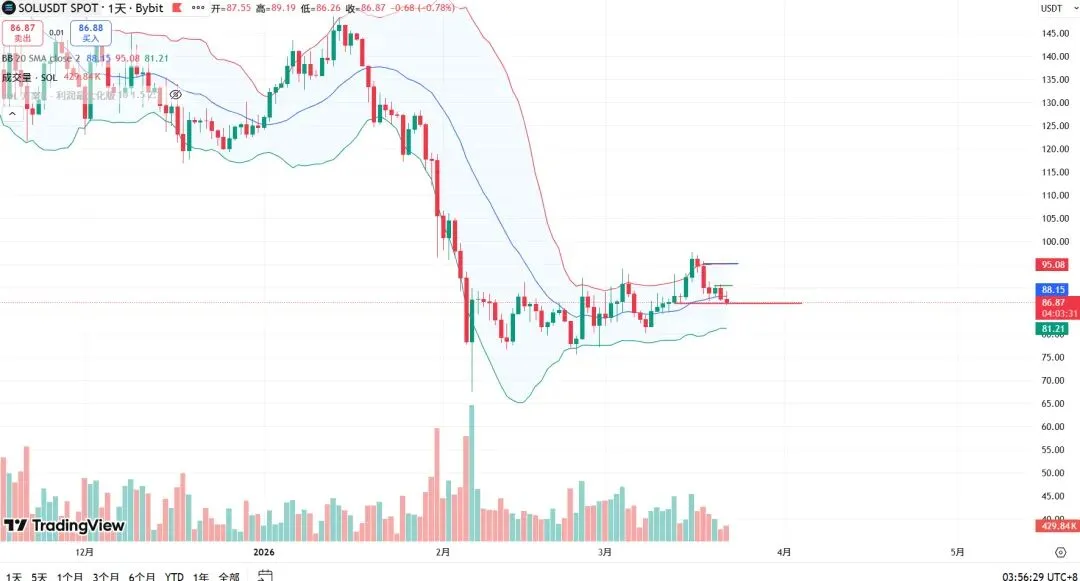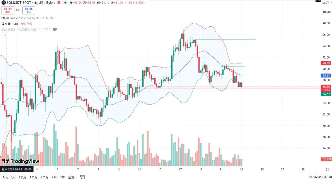 SOL价格:86.99USDT。比较前日90.14u 下跌📉3.15USDT