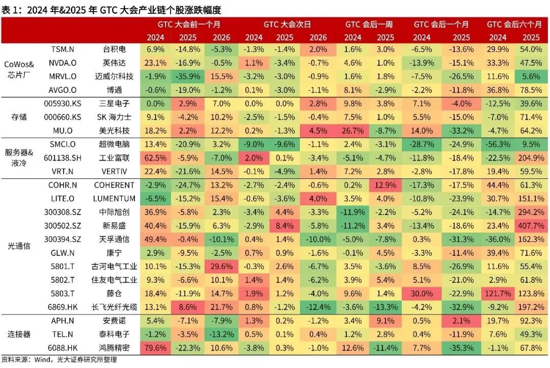 结合上述分析,与当年GTC大会技术路线高度契合的核心细分赛道,短期至中期内股价可能因多种因素扰动出现回调&分化,但长期内细分赛道龙头业绩&订单兑现度较高,带动股价显著上涨。本次GTC大会与OFC大会共振,GTC 2026发布Feyman架构+硅光互连,叠加OFC大会CPO、OCS超预期,光互联赛道有望受益。