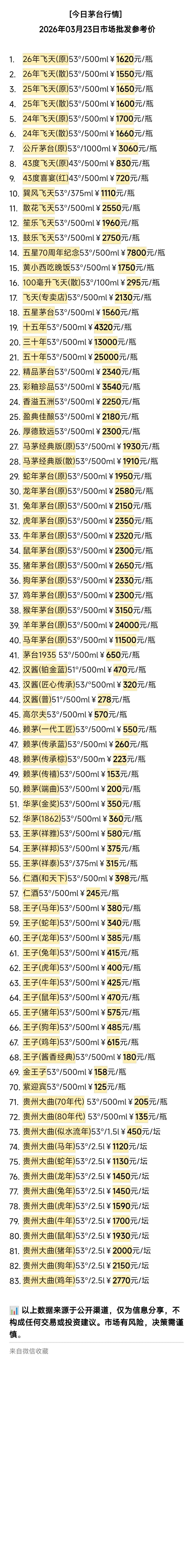 [今日茅台行情] 2026年03月23日:市场窄幅波动,2026年飞天茅台稳于1550-1620元一线,局部单品出现5-10元区间调整